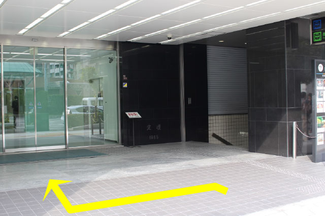 ・地上に上がりますと右側に正面玄関があります。中のエレベーターで9階までお進みください。